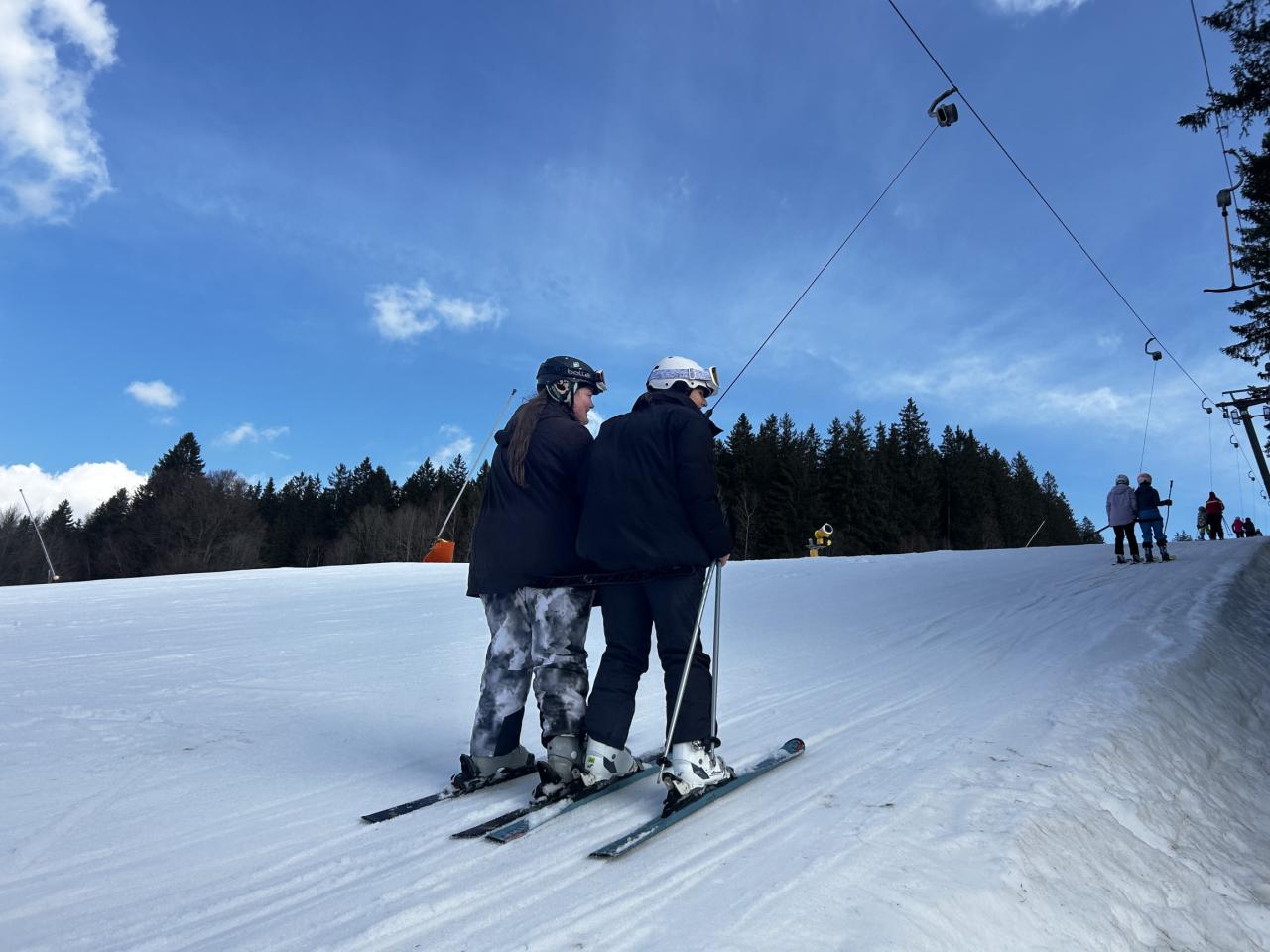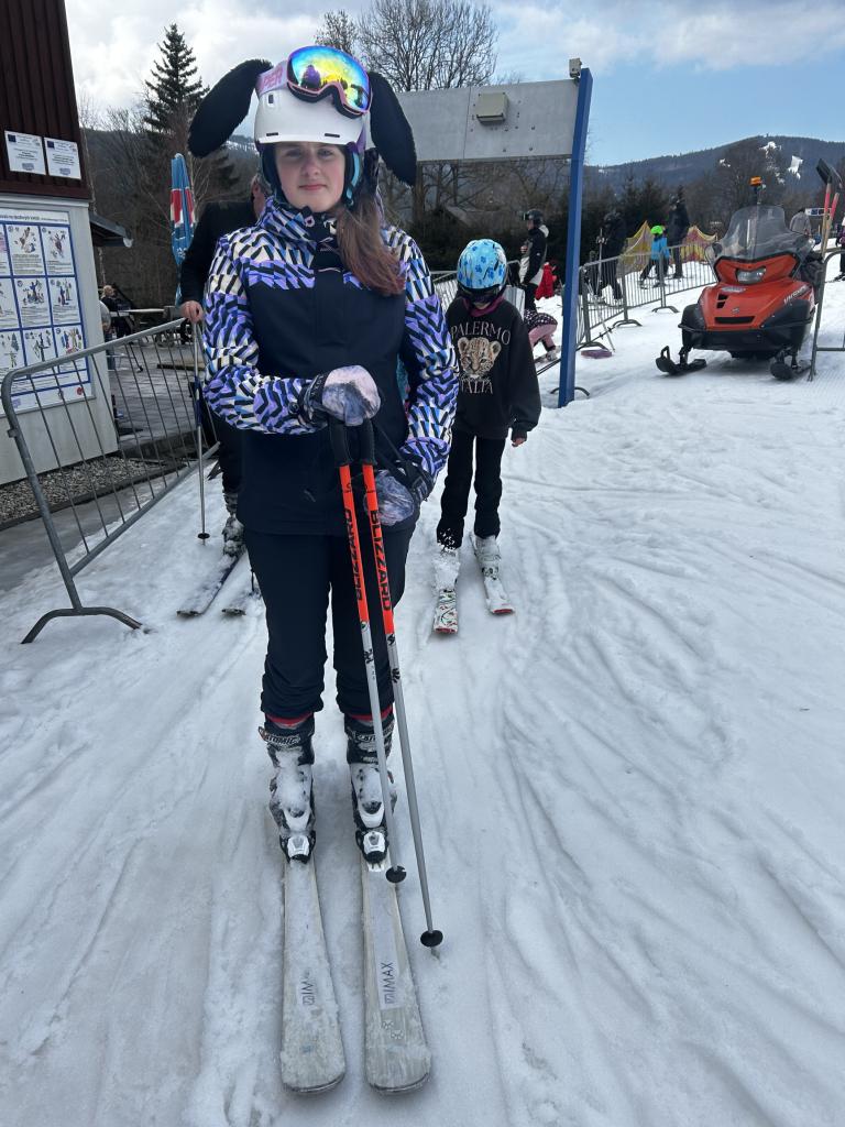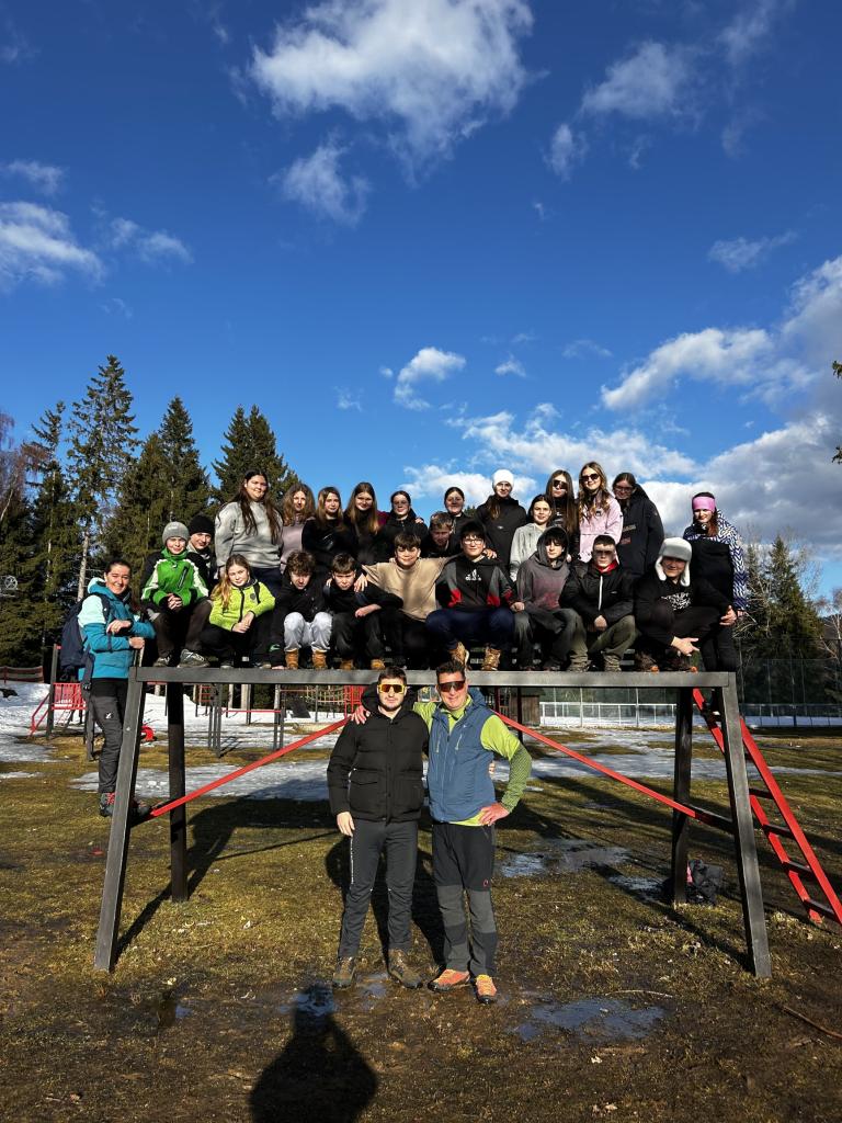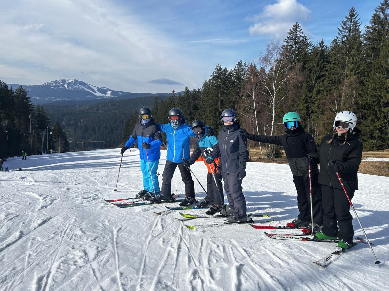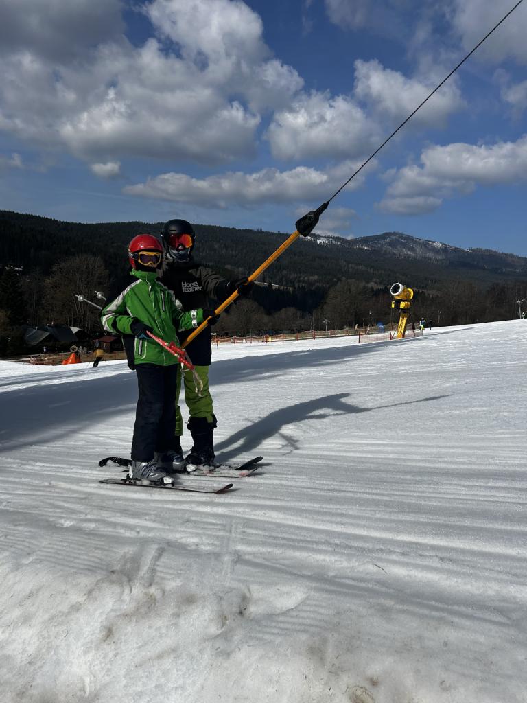 Naši žáci si užívají krásného počasí, lyžují na sjezdovce Nad Nádražím. Včera odpoledne šli na vlek už i úplní začátečníci.