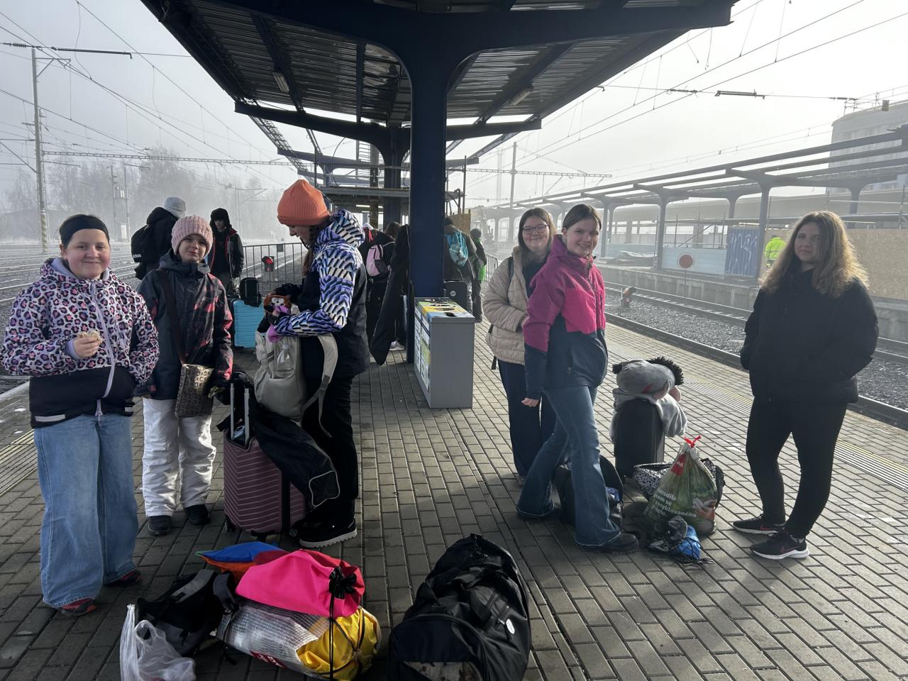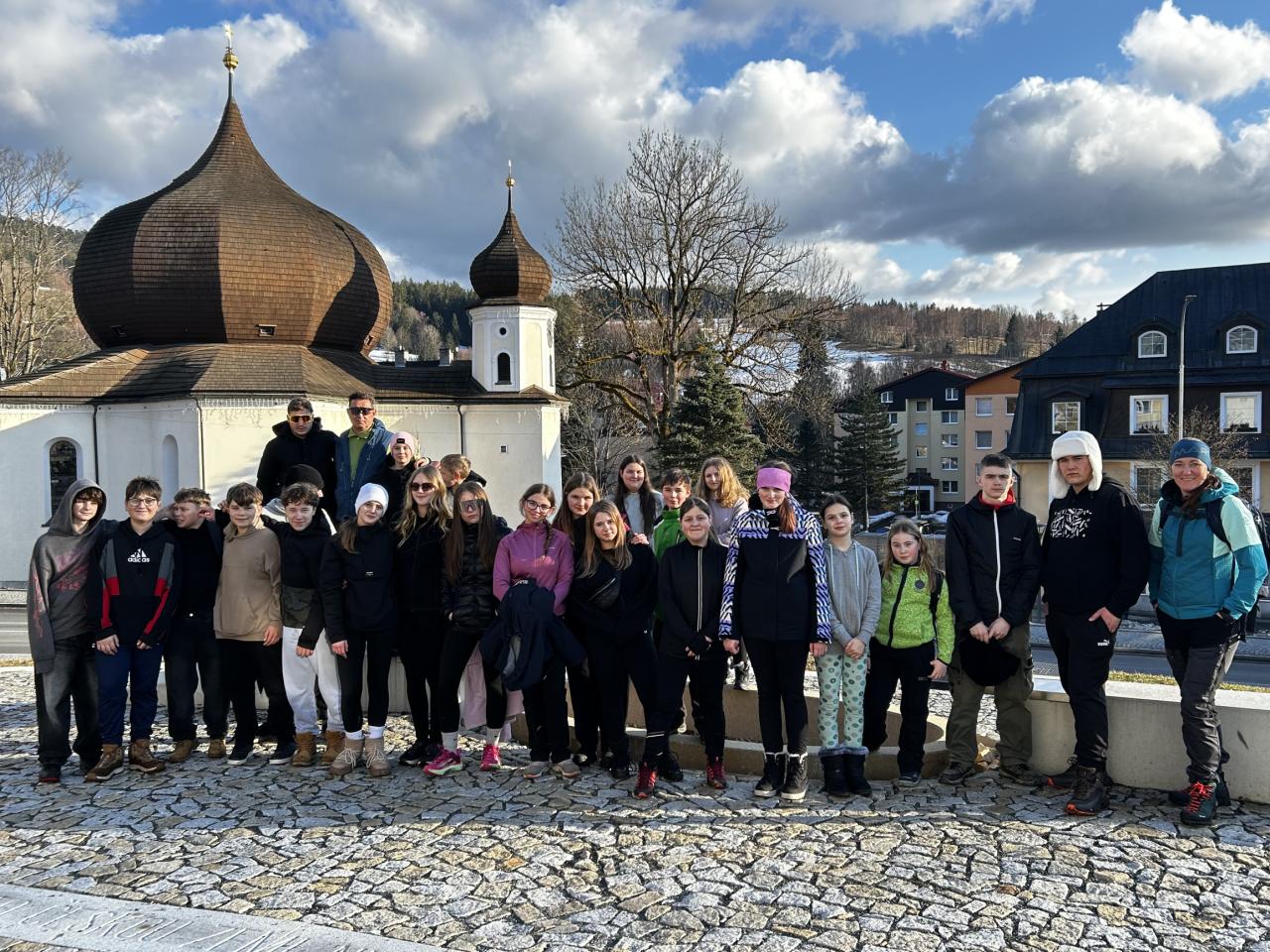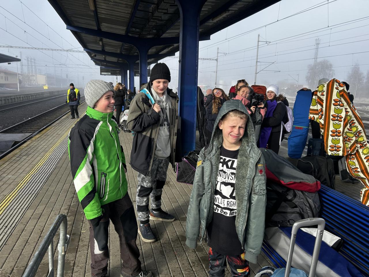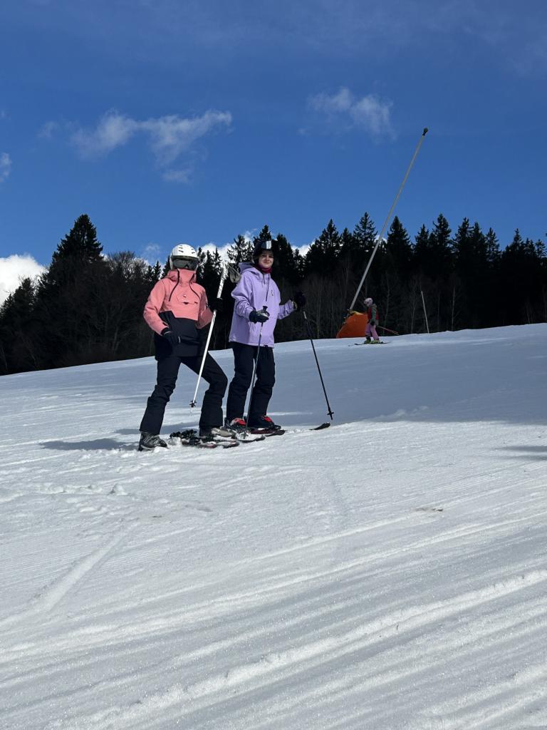 Naši žáci si užívají krásného počasí, lyžují na sjezdovce Nad Nádražím. Včera odpoledne šli na vlek už i úplní začátečníci.